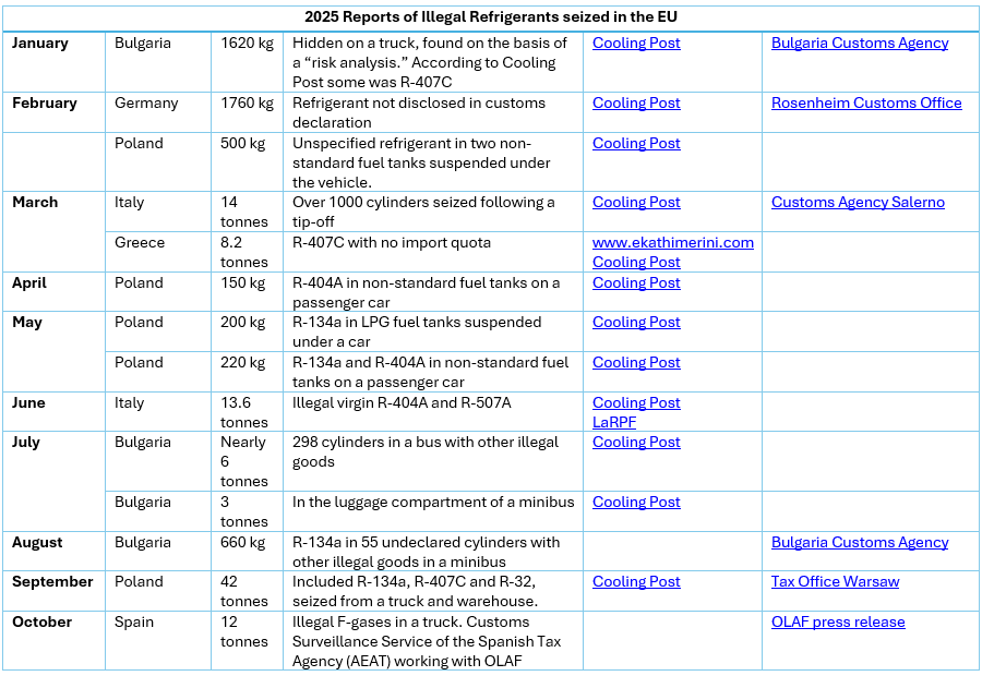 In this round-up: F-gas Regulation 2024/573 has specific measures to help combat illegal trade in HFCs to help maintain the integrity of the phase-down and specific use bans. In 2025, since the previous illegal trade round-up, customs authorities have intercepted illegal imports of HFCs. There are reports of deliberate mislabelling of virgin R-404A 7 R-507 as recycled (Cooling Post), or as compliant lower GWP refrigerants (Cooling Post). The illegal imports summarised in the table have links to detailed reports and cover over 100 tonnes of illegal refrigerants intercepted with several different import methods detected. Customs agency reports are available for some of the seizures, and Cooling Post is excellent at reporting the illegal trade. In the EU, use the anonymous European Anti-Fraud Office (OLAF) Fraud Notification System to report illicit HFC activity, see Home - Fluorocarbons and https://fns.olaf.europa.eu/.